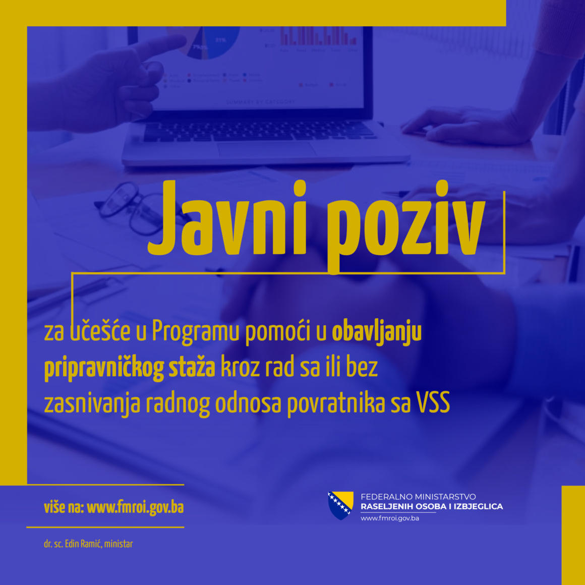 Javni poziv se objavljuje u svrhu prikupljanja prijava fizičkih lica – povratnika ili članova povratničkih domaćinstava, sa visokom stručnom spremom, kao i prijava pravnih lica (organi uprave, javne ustanove, javna ili privatna preduzeća, zadruge, obrtnici, udruženja i sl.) – zainteresovanih za angažovanje prijavljenih kandidata, u okviru Programa pomoći u obavljanju pripravničkog staža/stručnom osposobljavanju, kroz rad sa ili bez zasnivanja radnog odnosa, povratnika ne području entiteta Republika Srpska i slijedećih općina entiteta Federacija Bosne i Hercegovine:Odžak, Orašje, Domaljevac-Šamac, Čelić, Doboj Istok, Gradačac, Kalesija, Kladanj, Sapna, Teočak,Goražde , Foča FBiH, Pale FBiH, Prozor-Rama, Ravno, Stolac, Čapljina, Mostar, Bosansko Grahovo,Drvar, Glamoč, Kupres, Livno, Ključ, Bosanski Petrovac, Sanski Most, Bosanska Krupa, Bužim,