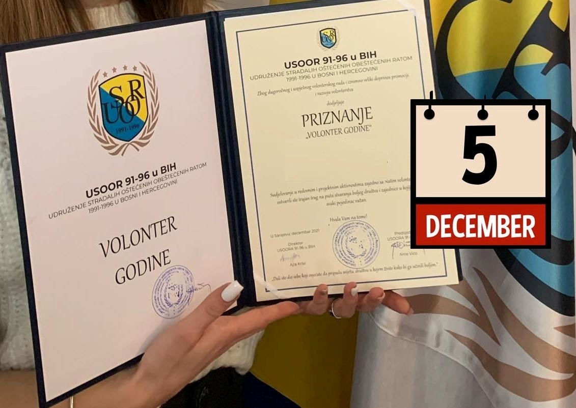 Povodom Međunarodnog dana volontera USOOR 91-96 U BIH će organizovati svečani prijem volontera u Regionalnom uredu Udruženja u Općini Ilidža i tom prilikom uručiti nagrade za najbolje volontere koji su tokom 2022 godini volontirali u Udruženju.
