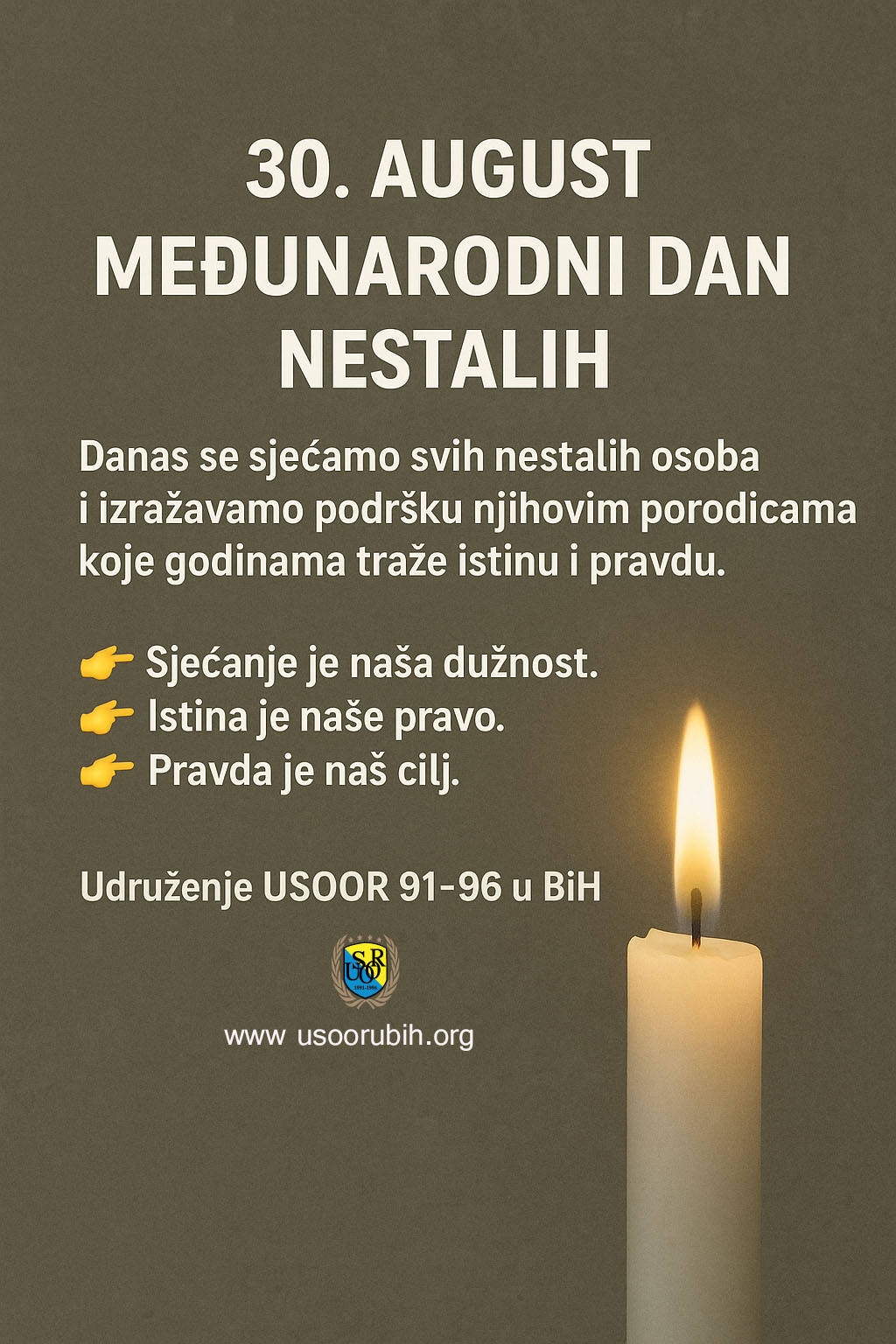 Udruženje USOOR 91-96 U BIH izražava solidarnost sa svim porodicama nestalih i posjeća da je potraga za istinom i pravdom zajednička odgovornost društva.