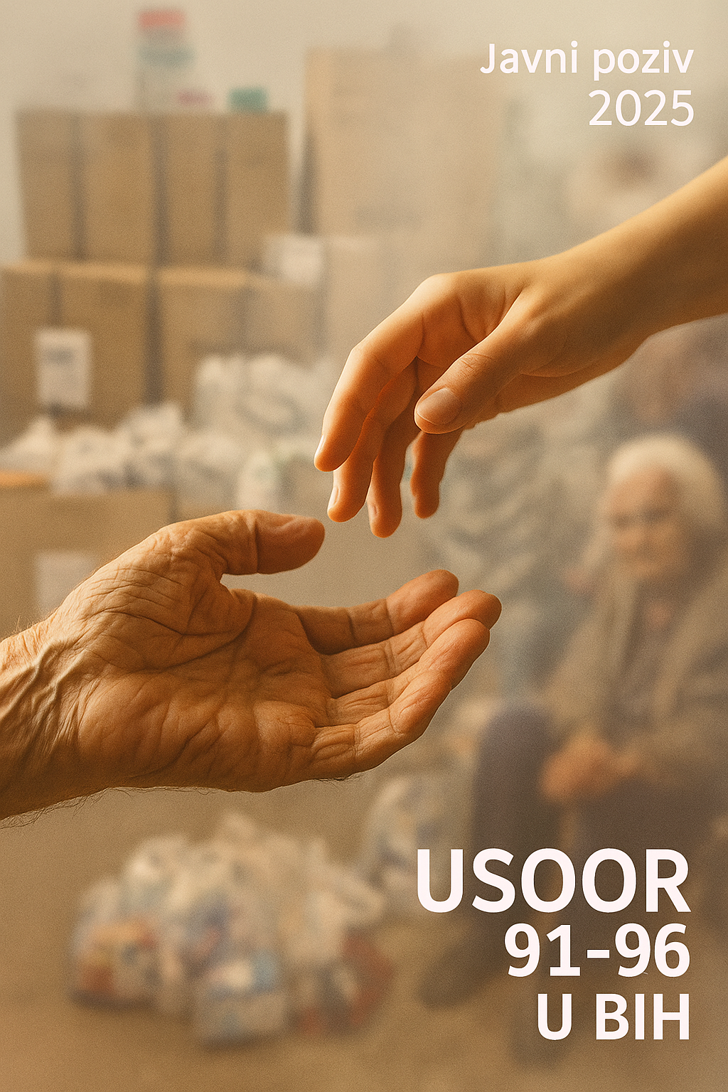 Udruženje USOOR 91–96 u BiH raspisuje javni poziv za prijavu korisnika humanitarne pomoći u okviru projekta „Ruka podrške“ briga o starijim i iznemoglim licima –humanitarne aktivnosti korisnika sredstava i dodjela pomoći za osobe u stanju socijalne potrebe, koji se realizuje na području Općine Novi Grad Sarajevo u periodu od 01.10. do 31.12.2025. godine.
